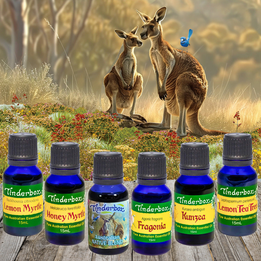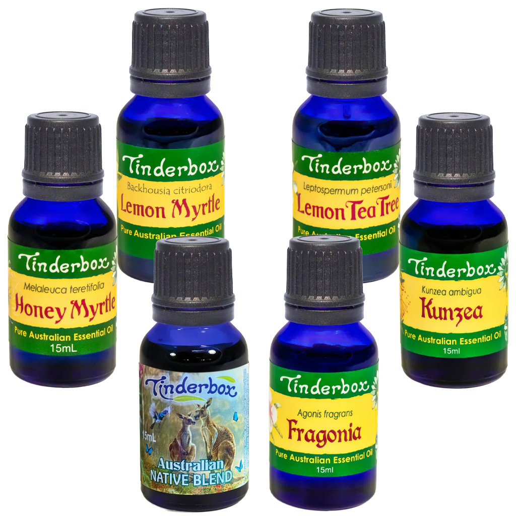 This kit contains pure essential oils of: Honey Myrtle, Lemon Tea-Tree, Lemon Myrtle, Fragonia, Kunzea and Australian Native Blend.